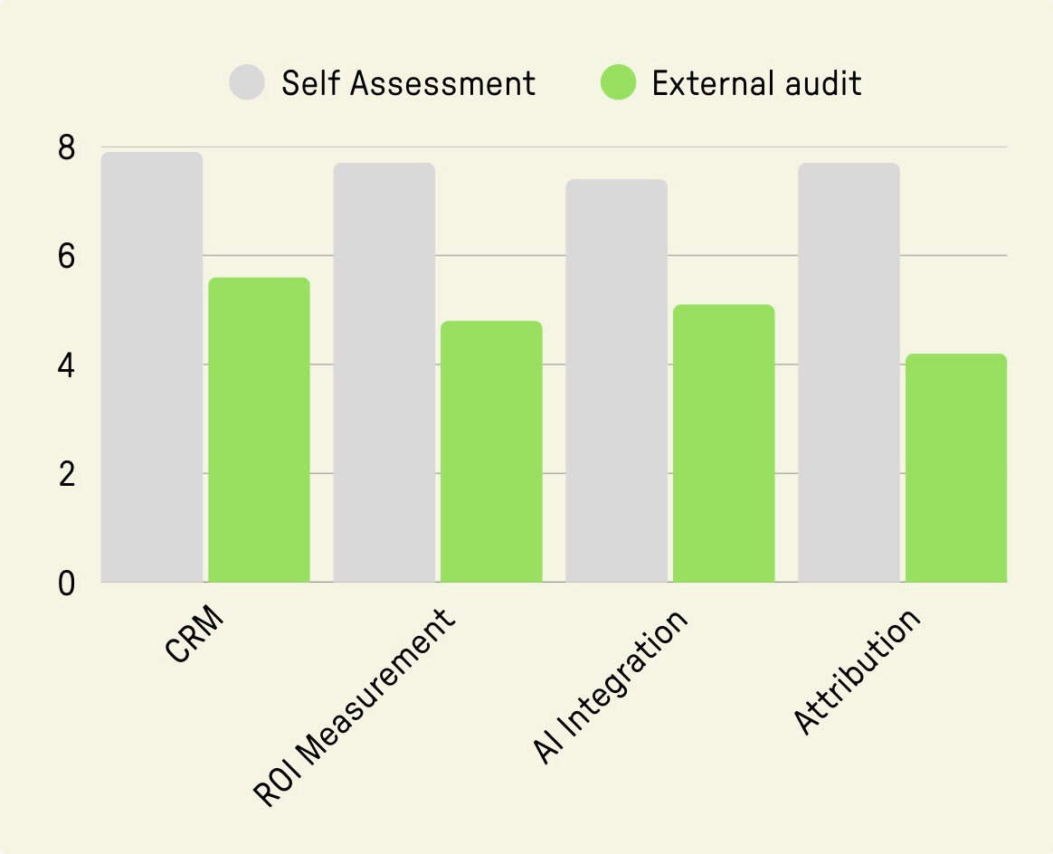 Notice how companies rate themselves almost identically on CRM (a 30-year-old discipline) and AI (which exploded 2 years ago). This uniform confidence across vastly different technology maturities suggests something deeper at play.