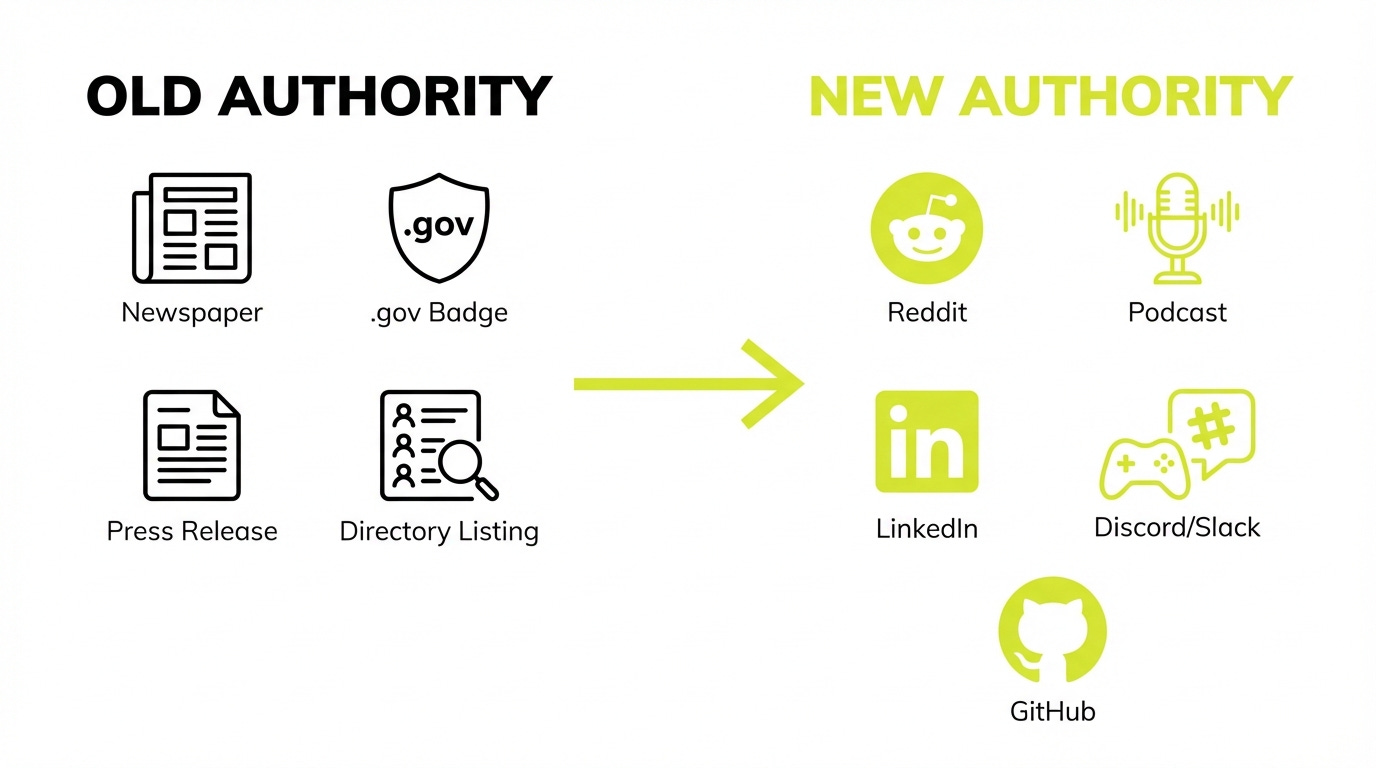 When ChatGPT trains on the internet, it doesn’t care about your “Domain Authority” score. It learns from conversations where people solve real problems. Reddit threads. Podcast transcripts. GitHub discussions. Discord servers. LinkedIn comment sections.