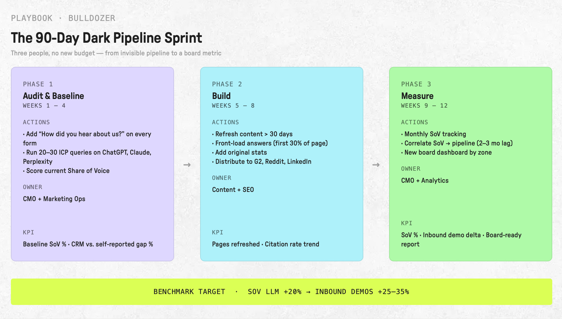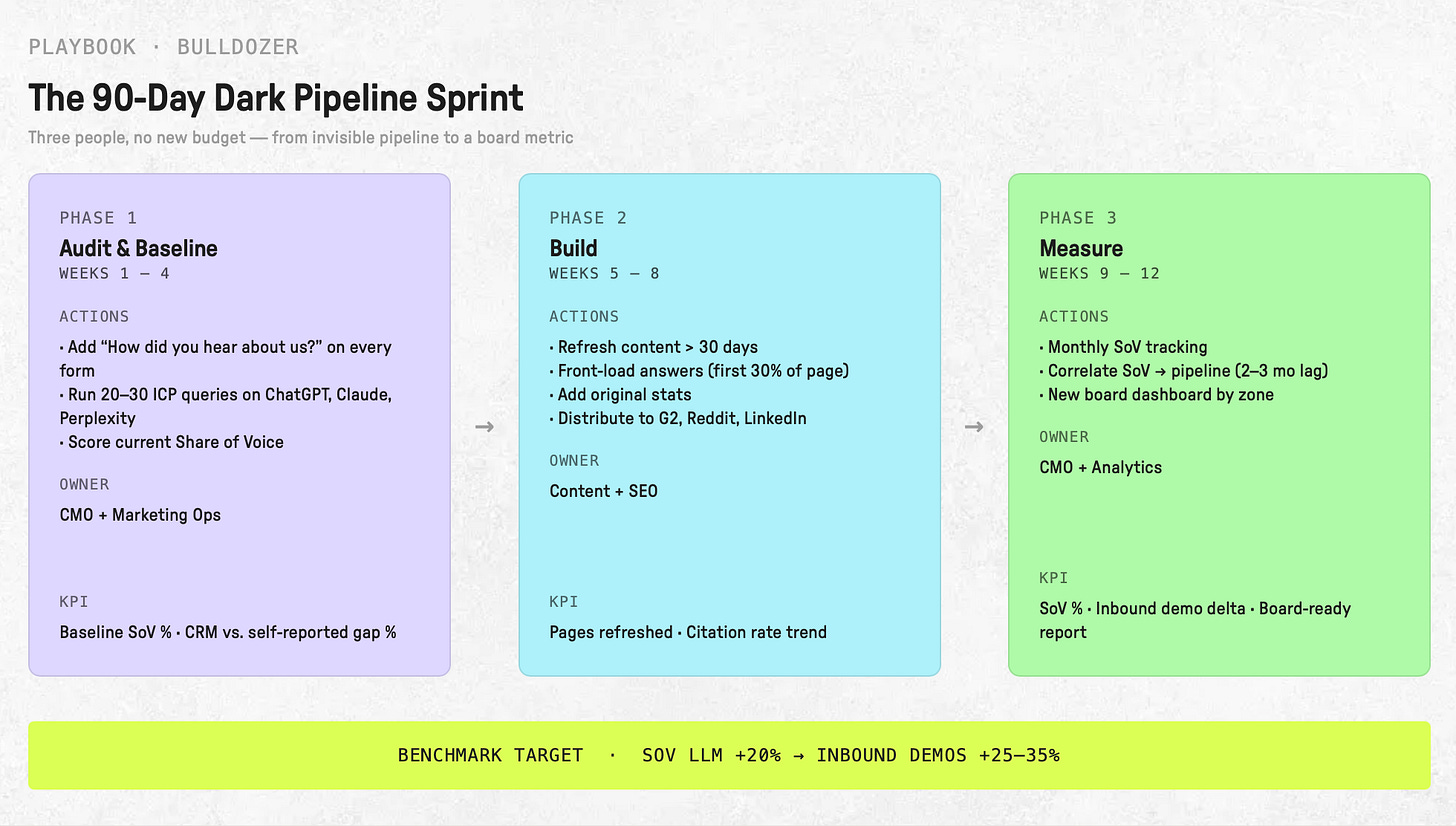New board dashboard. Retire “which channel generated this deal.” Replace with “Is our total influence growing?” — five lines: SoV LLM, brand search volume, inbound demos, sales cycle length, win rate vs. top three competitors.