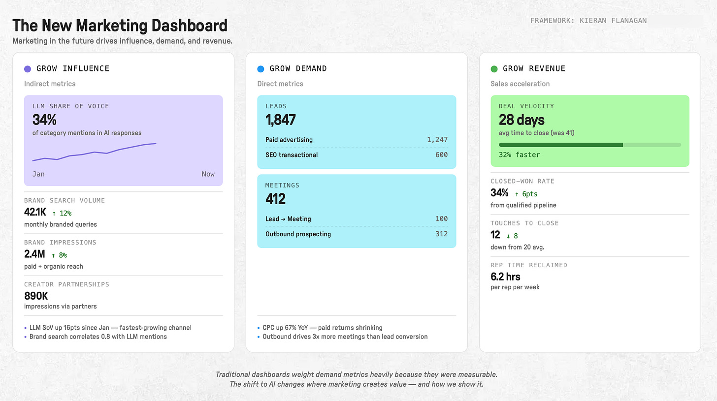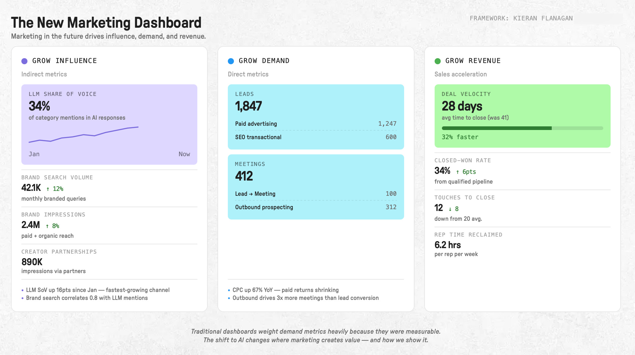Report by zone, not by channel. Build a three-column dashboard: Influence (what’s growing future demand), Demand (what’s converting now), Revenue (what’s closing). Kieran Flanagan, has shared the cleanest version I’ve seen — Grow Influence puts LLM Share of Voice as a top-line metric alongside brand search and brand impressions, Grow Demand tracks leads and meetings, and Grow Revenue tracks deal velocity, close rate, and touches to close. The CFO reads column two, the board reads column one, and you cover both without lying about attribution.